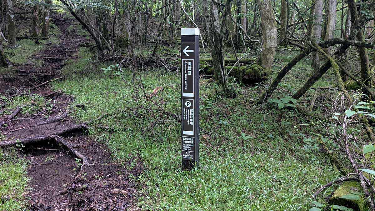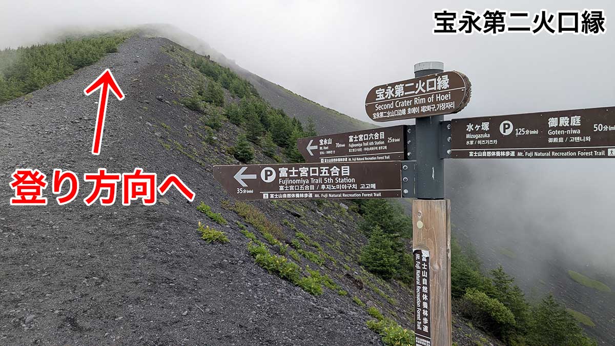 宝永第一火口縁の道標の少し先に、白い矢印看板があり、その看板が指し示す方向へ進みます。